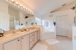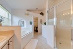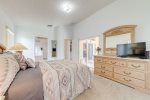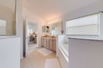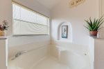 Master bedroom with queen sized bed, new 32” smart tv and ensuite bathroom, which includes large corner bath and walk-in shower.