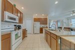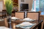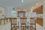 Our open kitchen is fully fitted with all the equipment a large family would require with a breakfast bar that seats 3. The dining area has a large table and six chairs.