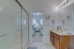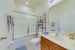 One bathroom next to queen bedroom & a jack & jill bathroom between the king & twins bedroom.