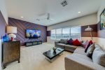 The comfortable family area with soft cushions and customisable lighting is a welcome pleasure after a busy day with large screen TV and DVD player.
