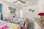 Twin Bedroom Three has twin beds, closet, ensuite with washbasin, tub/shower and toilet, brand new 32″ Smart TV, and large chest of drawers and bedside cabinets.