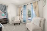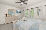 Master Bedroom Two has a Queensize Bed, closet, ensuite with washbasin, tub/shower and toilet, brand new 43″ 4K UHD Smart TV, and large chest of drawers and bedside cabinets.