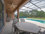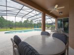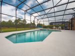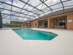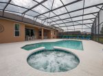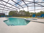 Pool : Over-sized 15'x 30' pool and raised jacuzzi spa (heating optional) west facing The deck area is a HUGE 30'x 48'- large enough to sunbathe anywhere around the pool. The external area is fully screened and has a safety fence for children around the pool. It has an abundance of full length sun loungers, chair recliners with ottamans and occasional tables. The Lanai hosts 2 tables each with 4 chairs. This screened area offers shelter from the sun and boasts an outside fan, a necessity for those who want to remain cool. There is the added luxury of piped music for those who wish to indulge.