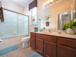 Bathroom 4 : Services bedrooms 4 and 5 with access to the pool deck too. Sink, vanity unit, bath with integral shower and WC. Hairdryer.