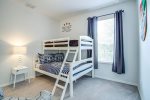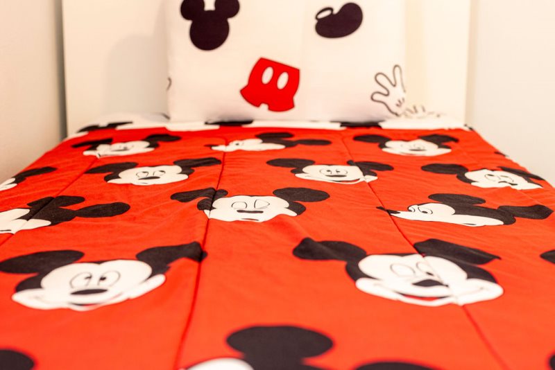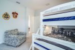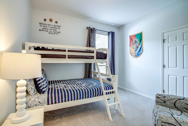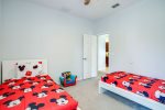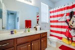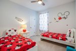 bathroom, a bedroom with 2 twin size beds, Disney themed and 1 bedroom with a bunk bed,