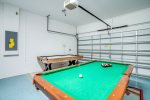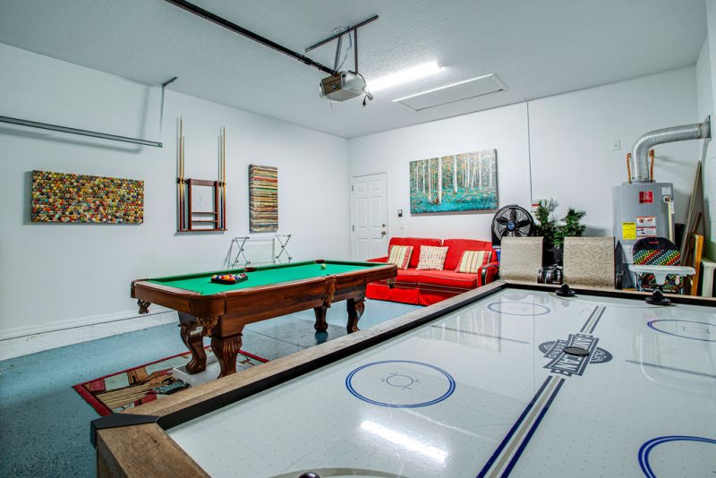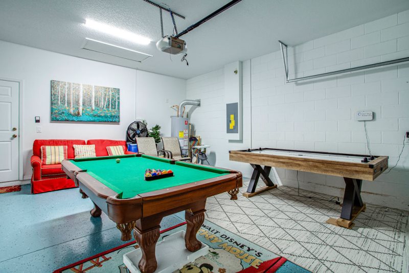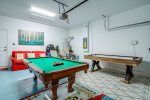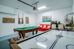 doors leading on to the pool and deck. A dining area that seats six and a game room with a pool