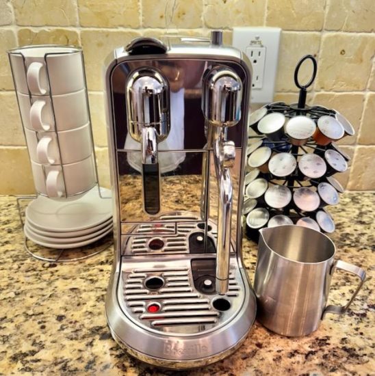 A fully equipped kitchen with oven, microwave, dishwasher, large American fridge/freezer with ice dispenser and an espresso coffee machine.