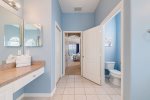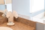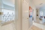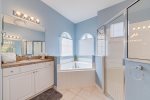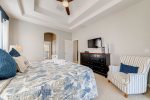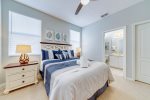 The first-floor master has a king size bed, patio doors leading to the pool area, walk-in closet, and large en-suite bathroom.
