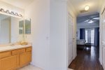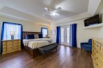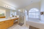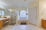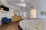The master bedroom has a new king bed, ensuite bathroom with soaking tub and separate shower, and direct access to the pool area.