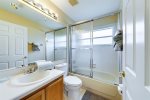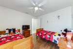 Bedroom 2 has a queen bed and shares a bathroom with Bedroom 3 with twin beds.