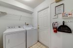 The utility room has a full sized washer and dryer along with ironing board and iron.