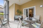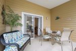This patio is larger than many of the other 2 bedroom apartments on the complex, with 6 chairs and a full sizes dining table allowing six people to sit around it