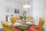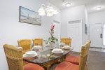 In the dining area of the villa there is a glass topped dining table seating 6, with enough plates to ensure that dining is a wonderful experience.