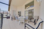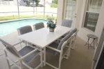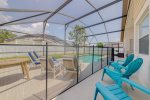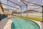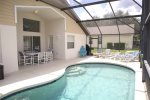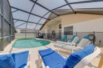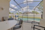 The pool deck is screened to protect it from bugs, and it offers a roofed seating area.