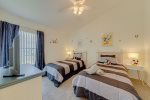 The other 2 rooms are equipped with 2 twin size beds respectively and share the 3rd bathroom.