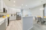 The expansive kitchen, fully stocked with essentials including crockery, pots, pans, utensils, and silverware, features upgraded stainless steel appliances.