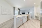 For coffee enthusiasts, the kitchen is equipped with a Keurig coffee machine, electric kettle, blender, and all the necessary accoutrements.