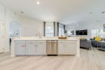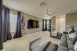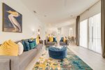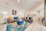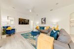The main living area, adjacent to the kitchen, offers two large sofas with an ottoman, a 75-inch TV mounted on a luxurious signature wall, and patio access to the pool and deck area.