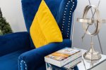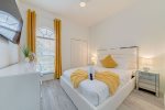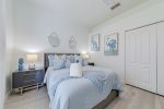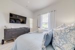 The front-facing queen bedroom offers superb comfort, featuring a leather headboard, stylish mirrored bedside cabinets, a roomy dresser, closet, and a 55-inch smart TV.