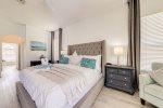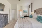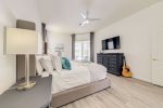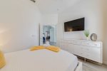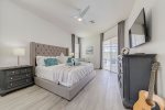 Just off this hallway lies the primary master bedroom, featuring a grand wing-backed king bed, direct pool access, a 55-inch wall-mounted TV, a spacious walk-in closet, and an ensuite bathroom.