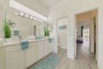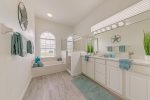 The bathroom boasts a double-sized shower, garden tub, separate WC, and a twin-sink vanity with quartz countertops.