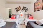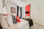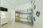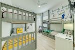 If you're eager to experience a taste of Diagon Alley without the wait at Universal Studios, our Harry Potter bedroom features four bunks adorned with the four Hogwarts houses, each courtesy of Pottery Barn. The room is equipped with a 32-inch smart TV, complete with enchanting Harry Potter decor.