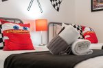 For those seeking a faster-paced adventure, our Lightning McQueen room is sure to rev up your dreams. Young racers can enjoy their own 32-inch smart TV while surrounded by their favorite Cars movie-themed decor.