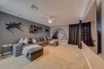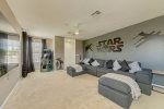 If you're in the mood for a more relaxed experience, ascend to our upstairs haven, featuring an 85-inch TV screen, blackout curtains, and a comfortable sofa in our Star Wars-themed movie room—an enclave designed especially for Jedi enthusiasts to unwind and immerse themselves in the galaxy far, far away.
