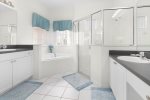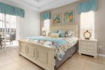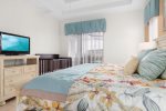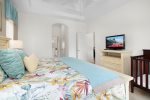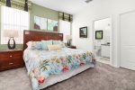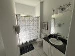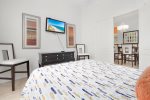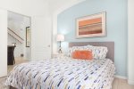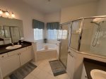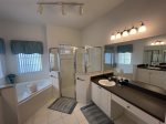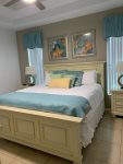 First floor master bedroom has a large en-suite with large shower and separate corner bathtub. King sized bed with new Sterns and Foster mattress. Lighted ceiling fan. Plenty of room for pak-n-play if needed. The other bedroom off formal dining area has a queen bed. Another full bathroom and half bathroom off the pool, are downstairs.