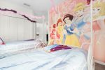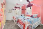 Beautiful Disney Princess themed oriented twin bedroom with carriage beds connected by a Jack-N-Jill bathroom, tub/shower.