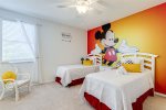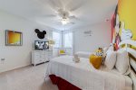 Finally, you will find two themed twin bedrooms (each with two single beds) connected by corridor to a shared en-suite bathroom (shower and bath). The fourth bedroom offers a vibrant traditional Mickey Mouse theme, and the fifth bedroom a fairytale backdrop of Magic Kingdom’s Castle.